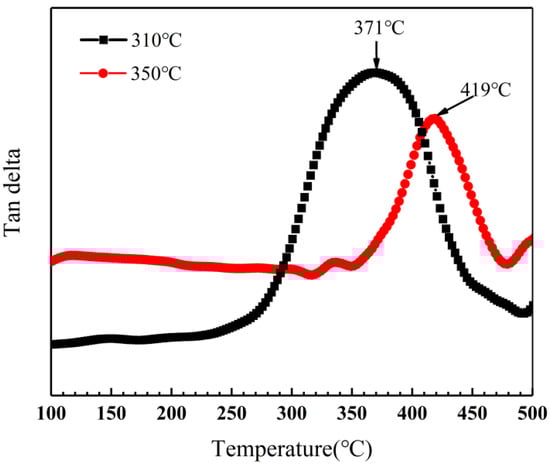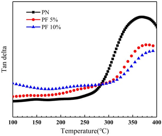 Figure 14 were all post cured at 310 °C to control variables. The results show that the glass transition temperature increases with the augment of novolac mass percent, verifying the correlation between curing degree and novolac addition.