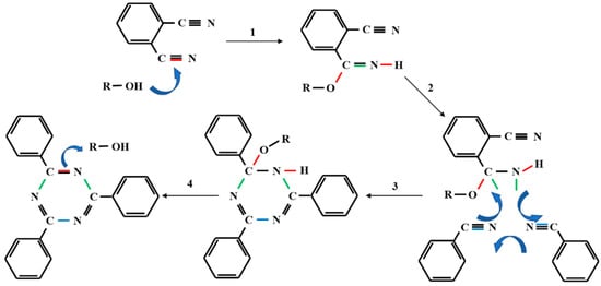 34]. The hydroxyl group of nucleophilic phenol groups in the phenol-containing phthalonitrile skeleton offered a rapid proton to catalyze the reaction of the nitrile groups in the same skeleton [