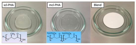 PHAs were produced by the University of Westminster (London, UK). Neat PHAs with short (C3-C5 monomer units, scl-PHA (P(3HB))) and medium (C6-C16 monomer units, mcl-PHA (poly(3-hydroxy octanoate-co-3-hydroxy decanoate) (P(3HO-3HD)) chain lengths were produced at large scale by means of a bioreactor with a capacity of 72 L using liquid bacterial culture. A standard purification protocol was applied to obtain ultra-pure PHAs. These materials were used to prepare films of neat scl-PHAs, mcl-PHAs, and the blend (P(3HB)/P(3HO-3HD)) (80scl-PHAs/20mcl-PHAs), by casting solution in Chloroform at a concentration of 5 wt % (Figure 1). These films were chemically characterized by gas chromatography-mass spectrometry (GC-MS) and thermally characterized by differential scanning calorimetry (DSC). The mechanical properties of the films were characterized by tensile tests.