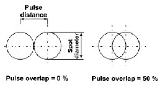 Neat and blended PHAs films were ablated by means of a picosecond pulse Nd:YVO4 laser (RAPID: Coherent, Münster, Germany) integrated in a micromachining workstation by 3D-Micromac. A detailed description of the experimental set-up can be found in a previous publication of our group [19]. Polymer films were irradiated with short-wavelength (355 and 532 nm) pulses. Craters were produced on the surface of the three considered PHAs by applying single pulses at a frequency of 10 kHz, which allows to achieve the highest pulse energy and scanning speed of 1000 mm/s. On the blend, pulse overlapping was also applied to generate grooves. The percentage of overlapping between pulses (Ud) can be calculated by Equation (1) as a function of the frequency of emission of the pulses (f), the speed of the scanner to move over the substrate (v) and the laser spot diameter (D) (Figure 2).