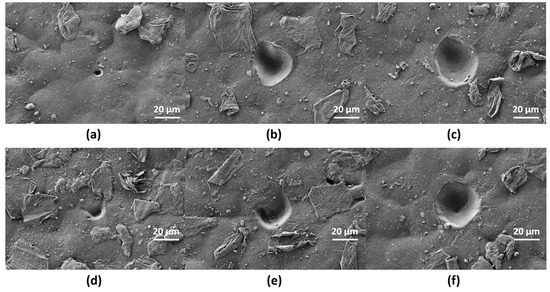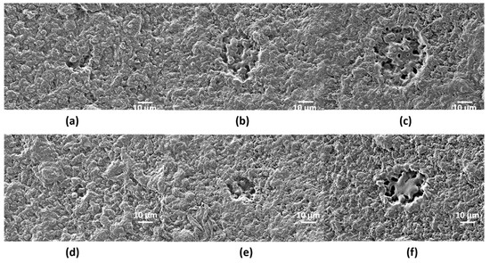 SEM images corresponding to single-shot craters at wavelengths of 355 nm (a–c) and 532 nm (d–f) on mcl-PHA at different energies: (a) E = 10 µJ, (b) E = 22 µJ, (c) E = 32.7 µJ, (d) E = 13 µJ, (e) E = 50 µJ, (f) E = 61 µJ.