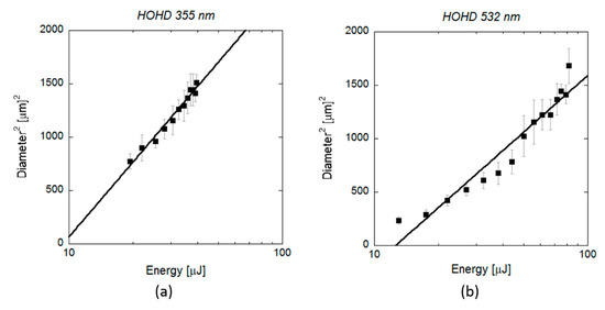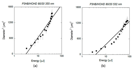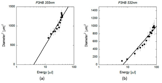 Squared diameter of the craters (black rectangles) produced by 10 ps pulses at a wavelength of (a) 355 and (b) 532 nm on scl-/mcl-PHA 80/20 blend and measured by SEM as function of the pulse energy. Lines indicate the fitting curves to Equation (2): (a) ω0 = (16.58 ± 0.08) µm and Eth = (3.1 ± 0.4) µJ, (b) ω0 = (13.96 ± 0.09) µm and Eth = (3.7 ± 0.6) µJ.