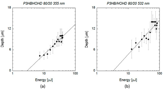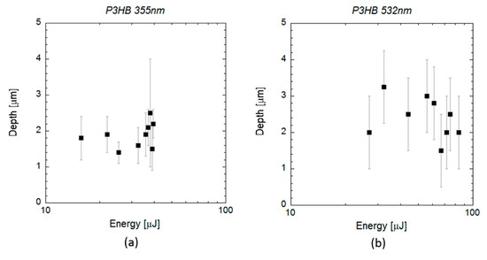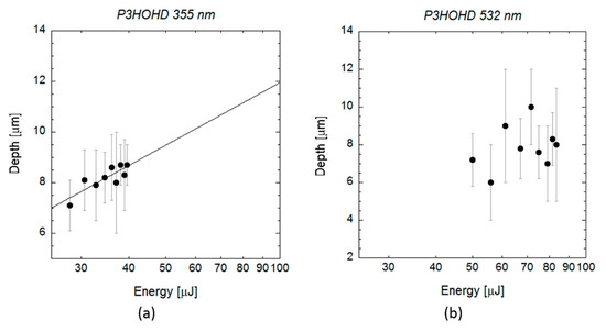 Data analysis of single pulse craters produced by 10 ps pulses (a) at a wavelength of 355 and (b) 532 nm on mcl-PHA. The graphs show the depth of the craters measured by profilometry (black circles) (a) for wavelengths of 355 nm and (b) 532 nm as a function of the pulse energy. Line indicates the fitting curve to Equation (3).