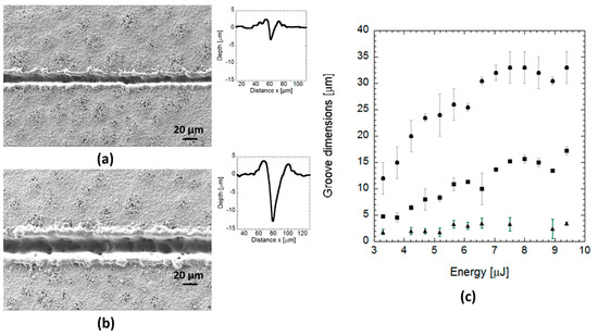 SEM images and topographic profiles corresponding to grooves machined by laser pulse overlapping on the blend at different pulse energy: (a) E = 3.8 µJ, (b) E = 9.4 µJ. (c) Evolution of groove width (circles), depth (squares), and height of the recast layers (triangles) with increasing pulse energy.
