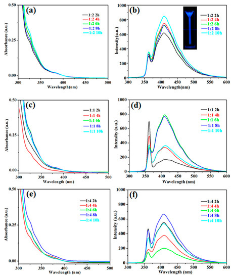 UV-Vis (a,c,e) and PL (b,d,f) spectra of ZnO QDs synthesized under different [Zn2+]/[OH−] molar ratios ((a,b) 1:2, (c,d) 1:1, (e,f) 1:4) and various heating times (2, 4, 6, 8 and 10 h). Photoluminescence (PL) spectra were recorded with excitation at 360 nm. Inset photo of ZnO QDs was taken under UV light (365 nm).