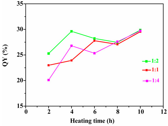 The quantum yields (QY) of ZnO QDs were measured according to the method described in reference [38]. Cumarin 1 was chosen as a reference standard (QY = 0.73). The QY of ZnO QDs synthesized under different [Zn2+]/[OH−] molar ratios were monitored during the heating process and the results show that the QY of ZnO QDs, prepared under different [Zn2+]/[OH−] molar ratios, could all reach 30%, as shown in Figure 2. The QY of ZnO QDs prepared under a [Zn2+]/[OH−] molar ratio of 1:2 and various heating times showed better results compared with other conditions, indicating the hydroxyl ions and their counter ions virtually influence the optical properties of ZnO QDs, even in the presence of HPEI.