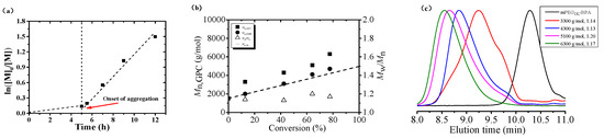 ln([M]0/[M]) as a function of time (a), number-average molecular weight (Mn,GPC) and molecular weight distribution (Mw/Mn) versus monomer conversion (b) and GPC elution curves (c) for photo-BIT-RDRPof BnMA. Polymerization conditions: [BnMA]0/[mPEG1k-BPA]0/[NaI]0/[TEA]0 = 20/1/2/0.5, VBnMA = 50 μL, Vmethanol = 0.5 mL, under irradiation with blue LED light (λmax = 464 nm, 0.15 mW/cm2) at room temperature (25 °C); BnMA concentration at 20.0 wt %.