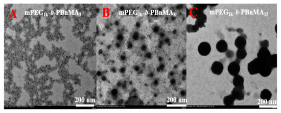 TEM images (A–C) of micelles from mPEG1k-b-PBnMAx (x = 3, 8, and 15, respectively) via one-step photo-BIT-RDRP-PISA using BnMA as the monomer. The samples obtained by the BnMA concentration at 20.0 wt %.