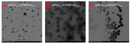 TEM images (A–C) of micelles from mPEG1k-b-PHPMAx (x = 75, 105, and 181, respectively) via one-step photo-BIT-RDRP-PISA using HPMA as the monomer. The samples obtained by the HPMA concentration at 20.0 wt %.