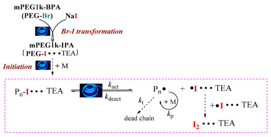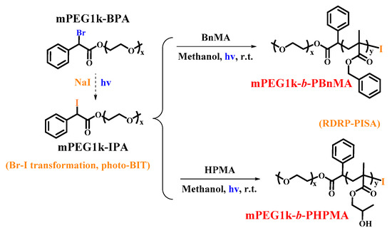 Alkyl iodides (R-I) are usually used as initiators and regulators in iodine-mediated RDRP [22,23,24,25]. However, the bond dissociation energy of the C-I bond is relatively low, so alkyl iodides are usually unstable and need special storage conditions, which limits the practical application of this polymerization method [26]. Recently, Goto’s group [26] and our group [27] reported thermal-initiated and photocontrolled in situ bromine-iodine transformation RDRP (BIT-RDRP) strategies, respectively. This method generates R-I in situ in a polymerization system by a nucleophilic substitution reaction of a relatively stable atom transfer radical polymerization (ATRP) initiator alkyl bromide (R-Br) with NaI (Scheme 1). Since commercially available ATRP R-Br initiators are used as the precursors in a BIT-RDRP process, this strategy avoids the introduction of transition metal catalysts usually used in a transition metal-mediated ATRP system. On the other hand, a PISA usually requires a two-step procedure. Generally, the solvent-soluble block is obtained in the first step, and then it is used as a macroinitiator to initiate the polymerization of the nucleating monomer to form an amphiphilic block copolymer in situ [28]. Very recently, our group introduced the first photo-BIT-RDRP into a two-step PISA process, and different micelle morphologies (spherical micelles and vesicle aggregates) were controllably generated by the two-step photo-BIT-RDRP-PISA method using polyethylene glycol methacrylate (PEGMA) and benzyl methacrylate (BnMA) as hydrophilic and hydrophobic monomer, respectively [29]. Through this strategy, we have successfully established a new PISA method by combination the advantages of both ATRP and iodine-mediated RDRP, which avoiding the use of transition metals in the ATRP and overcoming the shortcomings of the unstability of alkyl iodide initiator in the iodine-mediated RDRP method [29].
