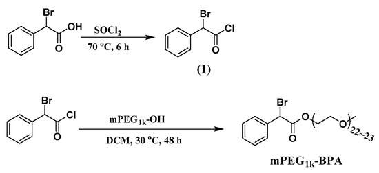 The polyethylene glycol monomethyl ether 2-bromo-2-phenylacetate (mPEG1k-BPA) was synthesized according to the method in the reference [30]. The typical procedure is shown in Scheme 3. Firstly, 20 mL of dichlorosulfane and 8.6 g of 2-bromo-2-phenylacetic acid (40 mmol) were added to a 50 mL three-necked flask. The temperature was raised to 70 °C under magnetic stirring and refluxed for 6 h. After cooling to room temperature, the remaining dichlorosulfane was removed by rotary evaporation to obtain 2-bromo-2-phenylacetyl chloride (1). Its structure was clearly characterized by NMR spectroscopy (1H-NMR (300 MHz, CDCl3, TMS, δ, ppm): 7.59–7.32 (m, 5H), 5.94 (s, 1H).