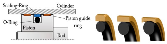 Coaxial sealing systems are assemblies consisting of a seal made from a material with advanced low friction properties and an O-ring that ensures the pre-tensioning of the entire package. Generally, the seal is made of polytetrafluoroethylene (virgin or filled PTFE) and the O-ring of elastomers of various types: nitrile butadiene rubber (NBR), fluorocarbon (FKM), ethylene propylene diene monomer (EPDM), hydrogenated nitrile butadiene rubber (HNBR), fluorosilicone (FVMQ), and silicone rubber (Q). Figure 1 shows an example of a coaxial sealing system used for a piston and several cross-section forms of the seal [21].