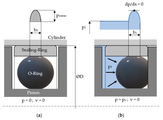 Distribution of pressure at the contact between the seal and the cylinder surface (v = 0) (a) in the absence and (b) presence of fluid pressure.