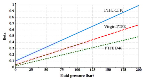 An initial specific radial deformation εr0 of 15% resulted for the dimensions of the O-ring seat. The real non-dimensional area β for the friction pair consisting of the steel cylinder and the three seals made of different materials depends on the initial specific radial deformation εr0 of the O-ring and on the fluid pressure. Figure 6 shows these dependencies.