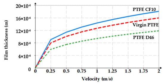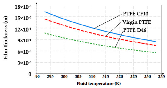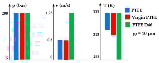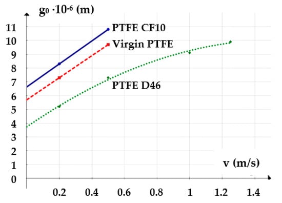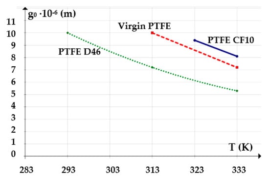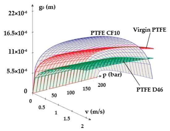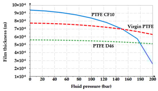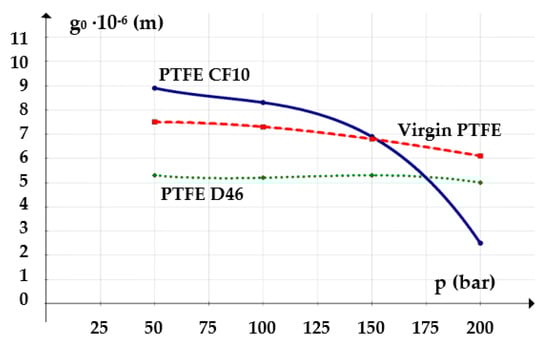 - While with increasing pressure a decrease of g0 can be noticed, for the analyzed interval from 0 to 200 bar, the diminishing of the fluid film was, however, rather small (of approximately 1 μm). For PTFE with carbon fibers (PTFE CF10) at high working pressures, the thickness of the fluid film decreased significantly up to 6.5 μm which worsens the conditions of friction;