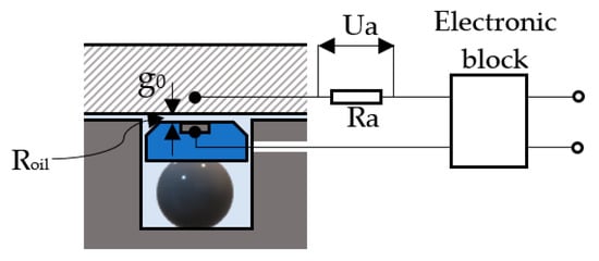 Resistance Roil is determined by fluid film of thickness g0, and Ra is the resistance of the utilized measuring device (Ra = 10 MΩ). In the presented measuring configuration, the electrical resistance Roil is computed by Equation (9):