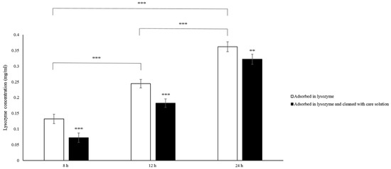 Differences in lysozyme deposition analysis and viscosity analysis between different conditions were assessed by the student’s t-test to make an allowance of comparisons. A value of p < 0.05 was considered significant.
