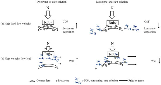 Although we proposed a potential model for the effect of γ-PGA in the lysozyme-ionic contact lens system under load and velocity variations, there are some limitations. We have not yet verified whether the amount of lysozyme deposition was indeed increased on the end of frictional cycles, or whether γ-PGA and lysozyme could form a stronger ionic bond than the bond between lysozyme and Etafilcon-A. In addition, we need to investigate whether γ-PGA would interact differently with ruby and with the Etafilcon-A lens to better understand the bio-tribological mechanism for velocity variations.