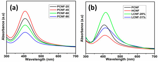 Figure 1 shows the UV-vis spectra of the reduced AgNPs on CNFs with different chemical compositions at different temperatures. UV-vis spectroscopy is an important technique for confirming the formation and stability of AgNPs in aqueous solutions. The size and shape of the AgNPs determine the spectral location and width of the absorption band (surface plasmon resonance (SPR) band). The UV-vis absorption of AgNPs is mostly known to exhibit a maximum within the range of 400–440 nm, due to their characteristics [29,30]. In this study, the effect of the reaction temperature on the formation and adsorption of AgNPs on PCNF was first investigated. As shown in Figure 1a, the intensity of the SPR peak increased as the temperature increased from 25 to 45 °C, and decreased at temperatures higher than 60 °C, exhibiting a maximum at 45 °C. Using this result, the temperature of 45 °C was selected to synthesize AgNPs on other CNFs (i.e., LCNF and HCNF). Digital photograph showing the aqueous dispersions of AgNPs adsorbed on different CNFs is shown in Figure S1. In this study, the wavelength of the absorption peak of AgNPs on PCNF (406 nm) did not change with the reaction temperature. However, peaks of AgNPs adsorbed on HCNF and LCNFs, under the same synthetic conditions, were observed at 412 and 416 nm, respectively (Figure 1b). This confirmed that the peak position for maximum absorption of the synthesized AgNPs changed, based on the chemical composition of the CNFs. Furthermore, the AgNPs absorbed light of different wavelengths based on their size and shape. The spherical form of AgNPs absorbed light within the wavelength range of 400–430 nm [11]. Thus, the absorption peaks within 406–416 nm suggested that the AgNPs obtained in this study were spherical. In summary, the wavelengths of the maximum absorption peaks increased in the order of PCNF < HCNF < LCNF. It is well-established that the wavelength of the SPR peak position is directly proportional to the particle size [11]. Hence, the increasing wavelength trend of the SPR peak, in the order of PCNF < HCNF < LCNF, implied that the sizes of AgNPs also increased in the same order. We assumed that PCNF, which had more hydroxyl groups, significantly controlled the growth of AgNPs during chemical reduction, whereas LCNF exhibited the least control. According to the study by James H. Johnston and Thomas Nilsson [31], lignin containing cellulosic fibers offers more binding sites (phenolic and methoxy groups attached to the electron rich aromatic rings of lignin) for the adsorption of nanosilver. However, the authors did not study the effect of lignin content. In our study, lignin containing CNFs, i.e., LCNF-20%, also exhibited more adsorption. However, increased lignin content (LCNF-31%) showed an adverse effect. Hence, we assume that the CNFs with moderate amounts of lignin can serve as good candidates for the adsorption of AgNPs.