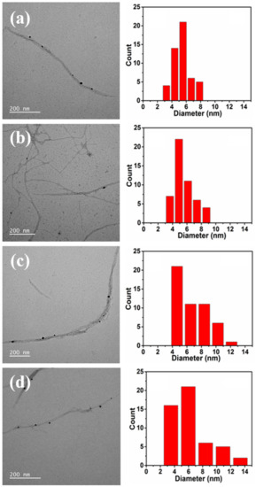 TEM images of AgNPs adsorbed on: (a) PCNF; (b) HCNF; (c) LCNF-20%; (d) LCNF-31%; and the corresponding histograms of the particle size distribution.