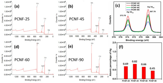 XPS survey profiles of AgNPs adsorbed on PCNF at different temperatures: (a) at 25 °C; (b) at 45 °C; (d) at 60 °C; and (e) at 90 °C. (c) High-resolution spectra of Ag3d; (f) atomic percentages of Ag in AgNPs adsorbed on PCNF at different temperatures.