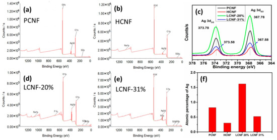 XPS survey profiles of AgNPs adsorbed on CNF with different contents, at 45 °C: (a) PCNF; (b) HCNF; (d) LCNF-20%; (e) LCNF-31%. (c) High-resolution Ag3d spectra of AgNPs adsorbed on CNF, with different contents, at 45 °C; (f) Atomic percentage of Ag in AgNPs adsorbed on CNF, with different contents, at 45 °C.