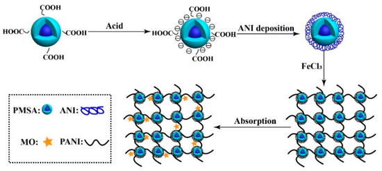 The core–shell PSMA nano-emulsion spheres were prepared following the literature [25]. Firstly, 19.018 g of St, 1.001 g of MMA, 1.001 g of AA, 0.383 g of NH4HCO3, and 0.003 g of SDBS were dissolved in 100 g of deionized water at 70 °C. After stirring for 30 min, 5.0 g of deionized water containing 0.484 g of APS was dropwise added to the system at 80 °C. After stirring for 10 h, the mixture gave PSMA without additional treatment. Subsequently, 6.0 g of PSMA and 2 g of ANI were dissolved in 50 g of deionized water, followed by ultrasound treatment for 15 min at 35 °C. Then, 50 mL of FeCl3 solution (5.481 g of FeCl3 dissolved in 50 mL of 0.5 mol/L HCl) was dropwise added to the reaction system. After stirring for 12 h, the product was filtered and washed three times with deionized water and anhydrous ethanol. The sample was dried at 60 °C under vacuum for 8–10 h. Accordingly, PANI/PSMA was obtained. The preparation and adsorption procedures are given in Figure 1.
