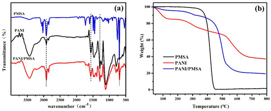 Fourier-transform infrared (FT-IR) curves (a) and thermogravimetric analysis (TGA) curves (b) for PANI, PSMA, and PANI/PSMA.
