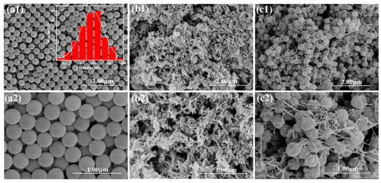 SEM photographs of PSMA (a1–2), PANI (b1–2), and PANI/PSMA(c1–2) (the inset graph in SEM image shows the size distribution measurements of PSMA).