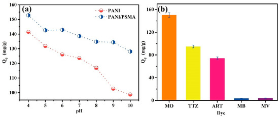 Because the intermolecular interactions between adsorbents and dye molecules are significantly affected by the pH, pH is a key parameter for dye adsorption [30,31]. The initial pH of solution determines the charges on the surface of the adsorbent. Figure S3 (Supplementary Materials) shows the zeta potential profiles of PSMA, PANI, and PANI/PSMA at different pH. The values of zeta potential of PSMA were about −60 in the pH range of 4–10, which indicated that PSMA possessed excellent stability. The pH values of PANI and PANI/PSMA were 6.0 and 4.7 at their isoelectric points, respectively. When the pH was lower than the isoelectric point, the imines and amines in PANI and PANI/PSMA had positive charges. Figure 4a shows the adsorption capacities of PANI and PANI/PSMA for MO at different pH. The results showed that the adsorption capacities decreased gradually with the increase of pH. This was because the basic imino and amino groups of adsorbents produced positive charges in an acidic environment, resulting in improved electrostatic attraction between adsorbents and anionic dye MO. With the increase of pH, the imino and amino groups were deprotonated, causing a smaller number of positive charges. As a result, the electrostatic attraction between adsorbents and MO decreased gradually, and the adsorption capacities decreased accordingly. Moreover, the adsorption capacity of PANI/PSMA was greater than that of PANI, indicating that the combination of PANI and PSMA exhibited a better adsorption performance. The adsorption capacities of PANI and the PANI/PSMA composite were greater at a lower pH.