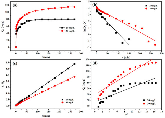 For a better understanding of rate-determining factors in the adsorption process, the adsorption data were analyzed on the basis of the intraparticle diffusion model [35,36] as described in Table 1. The correlation coefficients (R2) were 0.8077 (20 mg/L) and 0.9173 (30 mg/L). In the fitting of the intraparticle diffusion model, the fitting curve did not pass through the origin (Figure 5d), indicating that intraparticle diffusion was not the only rate-determining factor. It is supposed that electrostatic attraction, ion exchange, and some other factors may also affect the adsorption rate.