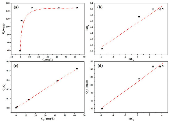 (a) Adsorption isotherms for the adsorption of MO by PANI/PSMA at pH 4.0 and 25 °C; (b) Freundlich isotherm model plots; (c) Langmuir isotherm model plots; (d) Temkin model plots.