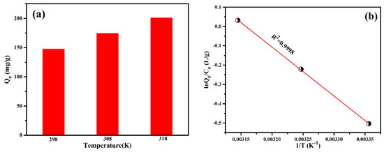 where Qe (mg/g) denotes the amount of dye adsorbed per gram of PANI/PSMA, Ce (mg/L) represents the equilibrium concentration of dyes, R stands for the ideal gas constant (8.314 J.mol−1·K−1), and T (K) denotes the reaction temperature. As shown in Figure 7a, the adsorption capacity of PANI/PSMA for MO increased with the increase of reaction temperature. Figure 7b shows that the correlation coefficient (R2) between ln(Qe/Ce) and 1/T was 0.9998, which indicates that the adsorption data were in good agreement with the van′t Hoff equation. ∆G0 (kJ.mol−1) can be calculated according to the following formula: