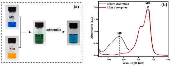 In wastewater treatment, adsorption selectivity is a key index of the performance of adsorbents [42,43]. Although many materials can adsorb MO, few materials show adsorption selectivity for MO. Thanks to the numerous positively charged amine groups on the surface of PANI/PSMA, anionic dyes can be exclusively adsorbed on PANI/PSMA from dye mixtures. The selectivity in the adsorption of a mixture of MO/MB on PANI/PSMA was tested, and the results are shown in Figure 8. Figure 8b shows that MB and MO dyes exhibited two intense absorption bands independently before the adsorption. After the addition of PSMA/PANI, the intensity of the absorption band corresponding to anionic dye MO decreased significantly, while that of cationic dye MB did not change significantly, indicating that PANI/PSMA can selectively adsorb anionic dyes from dye mixtures. As shown in Figure 8a, after the adsorption, the color of anionic dye MO faded, and the color of the mixture was close to that of cationic dye MB, which indicated that PANI/PSMA has high selectivity for anionic dyes.