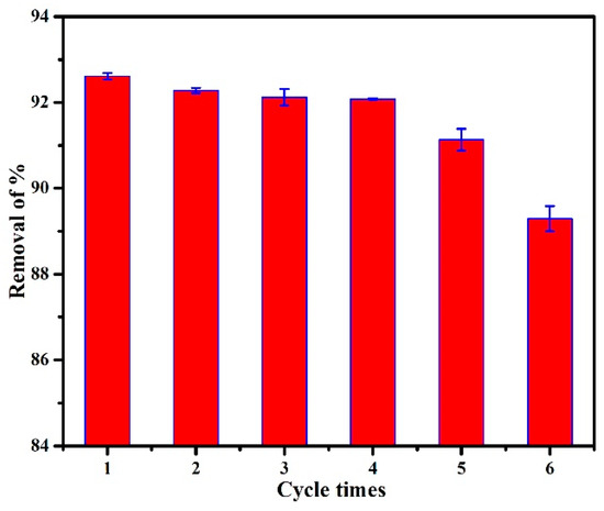 In practice, the adsorption–desorption recyclability is also a key index of the performance of adsorbents. In the adsorption process, electrostatic attraction was the main reason for the adsorption of MO onto PANI/PSMA. Under alkaline conditions, the zeta potential of PANI/PSMA was negative (Figure S3, Supplementary Materials), indicating weak electrostatic attraction between MO and PANI/PSMA. Therefore, the desorption of MO from the surface of PANI/PSMA can be achieved by treating it with an alkaline solution [25]. As shown in Figure 9, the removal rate of MO remained unchanged in the first four runs. In the fifth run, the removal rate slightly decreased to 91.13%, possibly due to the cleavage of polymer chains caused by the repeated treatment with acid/alkali during the cycles. Thus, PANI/PSMA showed good reusability for the removal of MO.