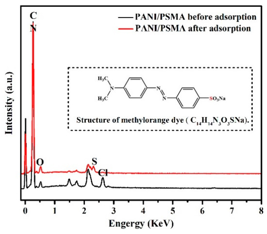 Energy-dispersive X-ray spectroscopy (EDS) spectra of the PANI/PSMA before and after adsorption (the inset in EDS spectra shows the structure of methyl orange dye).