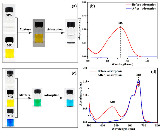 The photographs (a) and absorption spectra (b) of MO simulated industrial wastewater (SIW), and the photographs (c) and absorption spectra (d) of MO/MB-containing SIW before and after adsorption by PANI/PSMA.
