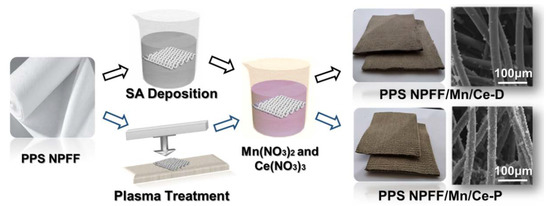 PPS NPFF (Gram weight: 580 g/m2, Thickness: 2.9 mm) were supplied by Xinli Environmental Protection Materials Co., Ltd. (Zibo, Shandong, China). Sodium alginate (SA, AR), manganese nitrate (Mn(NO3)2, AR) and cerium nitrate (Ce(NO3)3, AR) were purchased from Dingshengxin Chemical Co. Ltd. (Tianjin, China), Shanpu Chemical Co. Ltd. (Shanghai China), and Qingdao Haizhilin Co. Ltd. (Shandong, China), respectively. Nitric oxide (NO) and ammonia (NH3) were both provided by Qingdao Three-factors Gas Technology Co. Ltd. (Qingdao, Shandong, China). Compressed air without water (H2O) was obtained from Qingdao Haide Gas Co. Ltd. (Qingdao, Shandong, China).