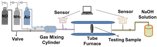 A home-made NH3-SCR denitration testing device (Figure 2) was designed and implemented by our group, to better mimic the practical denitration processing in the thermal power plant. The three different Mn/Ce Oxides loaded PPS NPFF samples were cut into a circular shape with a diameter of 10 cm, and further placed into a tube furnace with the total volume of 4.6 L. The whole device was connected with the silicone hoses to avoid the gas leakage. Before test, the compressed air was firstly introduced to keep the gas environment inside the channel in a normal air state. Then, the compressed air, NH3 and NO were continuously introduced into the channel, and the concentrations of each gas component in the inlet and outlet were monitored by the sensors in site. The total gas flow was maintained as 140 mL/min, and the compressed air flow was maintained at 120 mL/min. The range of NH3/NO flow ratio was 0.8–1.6. After the sensor display was stabilized, the tube furnace started to heat up. The pre-set testing temperature ranged from 80 °C to 220 °C. The sensor displays were recorded in a real time manner by using an intelligent test system (Shenwei Electronic Technology Co., Ltd., Shanghai, China) connected to a computer.