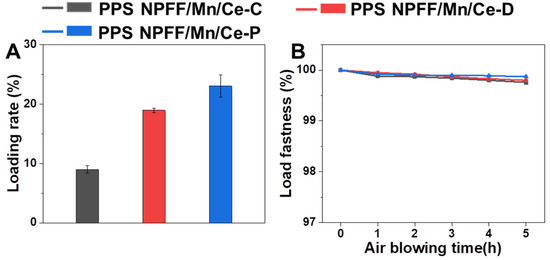 Catalyst loading fastness is another important indicator for evaluating the catalyst loading status on the surface of PPS NPFF. Figure 3B indicates that all three Mn/Ce oxides decorated PPS NPFF exhibited great catalyst loading stability. With the air blowing time increasing, the fastness of the catalyst decreased slightly. After 5 h of air blowing, the loading fastness was only slightly different from that of the original sample. Moreover, the loading fastness of PPS NPFF/Mn/Ce-P was higher than those of the other two groups, i.e., PPS NPFF/Mn/Ce-D and PPS NPFF/Mn/Ce-C, and the loading fastness of the PPS NPFF/Mn/Ce-P group still maintained 99.8% after 5 h of air blowing, which demonstrated that the low temperature plasma treatment could significantly improve adhesion between the Mn/Ce catalyst and the PPS NPFF.