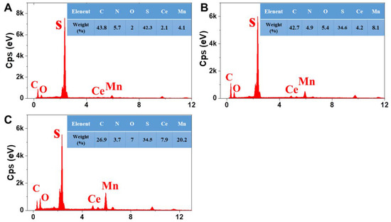 EDS (X-Max Energy-Dispersive X-ray spectrometer) images of the three different Mn/Ce oxides decorated PPS NPFF: (A) PPS NPFF/Mn/Ce-C; (B) PPS NPFF/Mn/Ce-D; (C) PPS NPFF/Mn/Ce-P.
