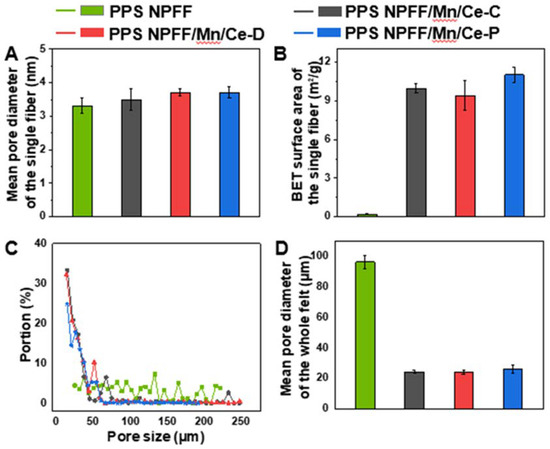 Figure 6A shows the testing results of mean pore diameter on the fiber surface. The mean pore diameters of original PPS NPFF, PPS NPFF/Mn/Ce-C, PPS NPFF/Mn/Ce-D, and PPS NPFF/Mn/Ce-P were determined to be 3.31 nm, 3.501 nm, 3.707 nm, and 3.706 nm, respectively. The surface area of the fibers was apparently different, as can be seen from Figure 6B. The original PPS NPFF has the lowest value of BET surface area (0.207 m2/g). In comparison, the BET surface area of the three different Mn/Ce oxides decorated PPS NPFF increased significantly, which may be due to the good dispersion of Mn/Ce particles on the PPS fiber surface. In the case of PPS NPFF/Mn/Ce-P, the BET surface area was greatly increased to 11.029 m2/g, most likely due to the abundant deposit of catalyst on the surface of the fiber. The obviously increased surface area may provide more space, which could favor the interaction between the catalyst and reaction gas.