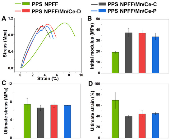 (A) Representative stress-strain curves, (B) initial modulus, (C) ultimate tensile stress, and (D) ultimate strain of the original PPS NPFF and the three different Mn/Ce oxides decorated PPS NPFF.