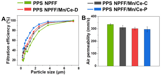 We performed filtration experiments on all PPS NPFF with or without further processing. Figure 8A comparatively depicts the grade efficiency of each sample for fine dust in the regime of 0.225 μm to 7.25 μm. The same profile pattern can be observed in all instances, i.e., the filtration efficiency increases with increasing particle size. Relatively low capture efficiency was found for the original PPS NPFF. As expected, the catalyst loading process could improve the overall filtration performance, showing a much higher capture efficiency than that of the original PPS NPFF. This observation is ascribed to the significantly reduced pore diameter distribution and mean pore diameter, caused by the catalyst loading process. The PPS NPFF/Mn/Ce-P showed the highest efficiency among all the samples, indicating the advantages of applying the low temperature plasma treatment on the PPS NPFF modification. In practice, all the three different Mn/Ce oxides decorated PPS NPFF, i.e., PPS NPFF/Mn/Ce-C, PPS NPFF/Mn/Ce-D, PPS NPFF/Mn/Ce-P, could perform well when target particles were larger than 4 μm. It is also observed in Figure 8B that the catalyst loading process did not affect the overall air permeability of the three different Mn/Ce oxides decorated PPS NPFF, presenting slightly reduced air permeability compared with the original PPS NPFF.