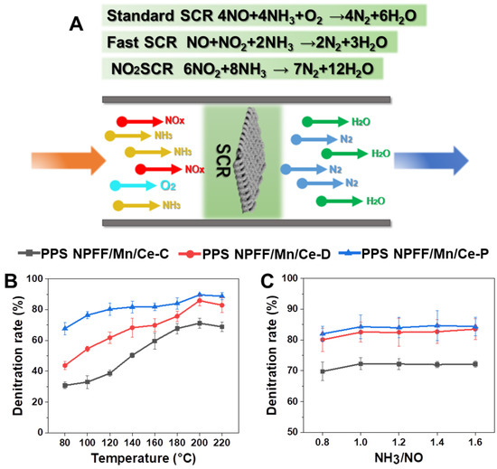 The general reactions involved in NH3-SCR are shown in Figure 9A. NH3 was employed as a reducing agent to reduce harmful NOx to harmless N2 and H2O under the synergetic action with O2. There were three general reactions, which were called standard SCR, fast SCR, and NO2 SCR reactions [7,32]. The catalyst performance was found to be a dominant factor for the above-mentioned reactions [11,33]. In the present study, we employed two pretreatment methods including SA deposition and plasma treatment to modify the PPS NPFF before the impregnation process to help improve the catalyst loading rate and stability, which was expected to be conducive for the NH3-SCR denitration activity. Figure 9B,C shows the effect of different preparation methods on the denitration activity of finally-obtained Mn/Ce oxides decorated PPS NPFF. Figure 9B indicates that the Mn/Ce oxides decorated PPS NPFF prepared with three different methods imparted different catalytic activities in the temperature range of 80 °C to 220 °C. In general, the PPS NPFF/Mn/Ce-D and PPS NPFF/Mn/Ce-P which both experienced pretreatment exhibited better catalytic activity and presented higher denitration rate, compared to PPS NPFF/Mn/Ce-C without pretreatment. The same pattern can be observed in all instances, i.e., the denitration rate increased with increasing temperature from 80 °C to 200 °C. The denitration rate reached the optimum value at 200 °C. When the temperature exceeded 200 °C, the denitration rate decreased slightly. Importantly, it can be concluded that PPS NPFF/Mn/Ce-P prepared by low temperature plasma treatment exhibited the highest denitration rate, and the denitration rate reached more than 80% at 220 °C. The previous studies have also demonstrated that the reaction temperature played a determined role on the denitration rate of the Mn/Ce catalyst [34,35].