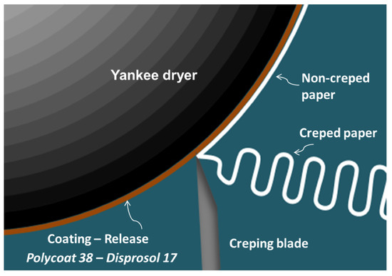 Coatings are adhesive compounds which facilitate the operation of the creping machines since they allow the paper to adhere to the yankee dryer’s surface at the last step of the tissue paper conversion [1]. These are used in conjunction with a release agent that controls the hardness of the coating and its adhesion, allowing the demolding of the paper once in contact with the creping blade as shown in Figure 1 [1].