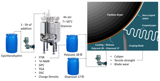Polycoat 38®, which is a polyamine obtained by the A. Allen modified method [15], uses a difunctional polyamine or diamine with epichlorohydrin for the polymer synthesis with the addition of polyvinyl alcohol between 25–60 °C, and it is advantageous providing strong adhesion of the cellulosic fiber web to the dryer surface during the creping process to attain a soft, bulky tissue paper web [15,16].