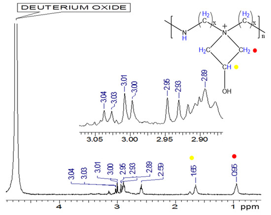 Finally, a signal from the NH and the OH protons of the chain would be expected around 8 ppm. However, the signal is not observed due to the presence of the deuterated solvent that causes an exchange of protons with the hydrogens of this groups and decreases the intensity of the signals [25]. The figure also shows the possible structure of the cationic polymer and its corresponding azetidine ring [4].