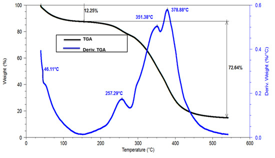 Figure 5 shows the weight loss of the polymer in function of the temperature. The first loss is due to the amount of water retained in the interstices of the polymer which tend to evaporate between 45 and 100 °C [29]. The second loss is observed between 351 and 378 °C, corresponding to the rupture of the main chains in the polymer, leading to its degradation [25]. The given temperature is higher than the working temperature of the surface of the yankee [5], which indicates that there will be no problems due to the deterioration and subsequent breakage of the main chains of the polymer and the opening of the azetidine rings [5], needed to adhere the paper through OH cellulose groups on the yankee’s surface [30].This indicates that a loss of durability of the coating will not be present since the yankee surface temperature is lesser than the coating degradation temperature [5], meaning that the coating performance will not be affected, so loss of bulk in the finished paper rolls and cross machine direction profile issues of uniformity in the produced paper roll will not be observed [7].