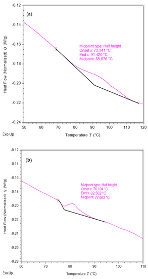 In this case, the temperature of the yankee where the product was proven exceeded 100 °C and it can be seen in Figure 6 that the Tg of the coating alone and emulsified with release in a proportion similar to that used in the yankee were 85.7 and 77.7 °C, in which the polymer behaves like a thermoplastic rubber and is soft enough to produce high quality paper [31]. This DSC behavior was similar to other polyamide-based resins as reported by Huang K. et al. [32].